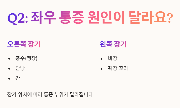 Q2: 오른쪽 옆구리 통증과 왼쪽 옆구리 통증의 원인은 다른가요?