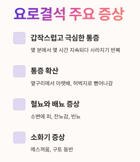 요로결석처럼 갑작스럽게 나타나지만, 통증의 양상은 조금 달라요.