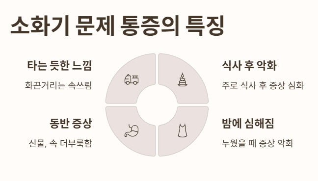 - 주로 식사 후나 밤에 누웠을 때 증상이 심해지며, 신물이 올라오거나 속이 더부룩한 증상을 동반하기도 합니다.