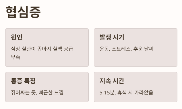 - 주로 운동하거나 스트레스를 받을 때, 추운 날씨에 '쥐어짜는 듯' 또는 '뻐근한' 통증이 나타납니다.