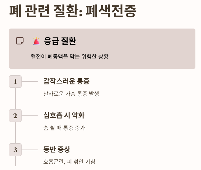 - 갑작스럽고 날카로운 가슴 통증이 특징이며, 심호흡 시 악화되고 호흡 곤란이나 피 섞인 기침을 동반할 수 있습니다.