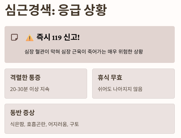 - 만약 식은땀, 호흡곤란과 함께 극심한 통증이 20분 이상 지속된다면(심근경색) 즉시 응급실에 가야 합니다.