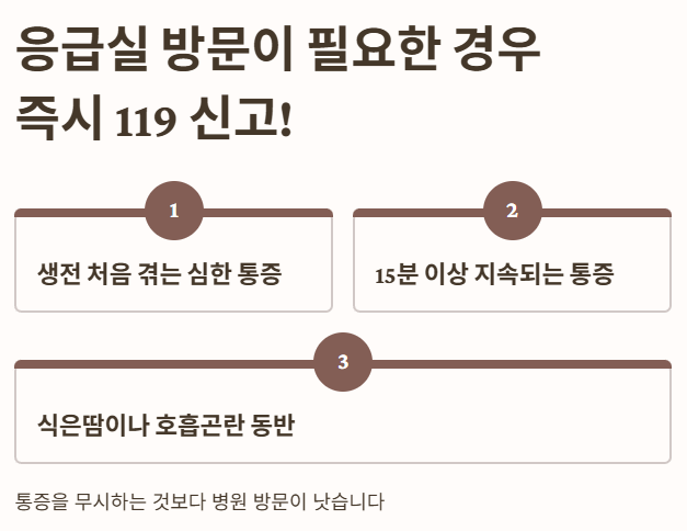 - 만약 생전 처음 겪는 극심한 통증, 15분 이상 지속되는 통증, 식은땀이나 호흡 곤란을 동반하는 통증이라면 즉시 119에 연락하거나 응급실을 방문해야 합니다.