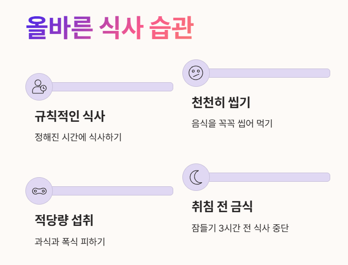 - 한 번에 많이 먹는 과식이나 폭식은 위에 큰 부담을 주므로 피하고, 특히 잠자리에 들기 3시간 전에는 음식을 먹지 않는 것이 좋습니다.