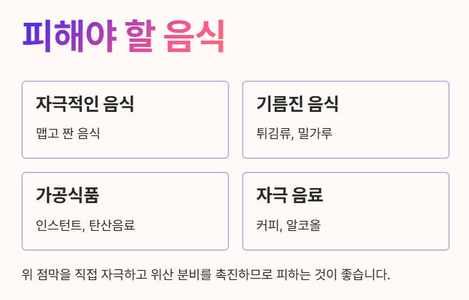 - 맵고 짠 자극적인 음식, 기름진 튀김류, 밀가루 음식, 인스턴트식품, 탄산음료, 그리고 카페인이 많은 커피나 알코올 등은 위 점막을 직접적으로 자극하고 위산 분비를 촉진하므로 피하는 것이 좋습니다. 🙅♀️