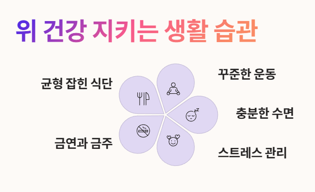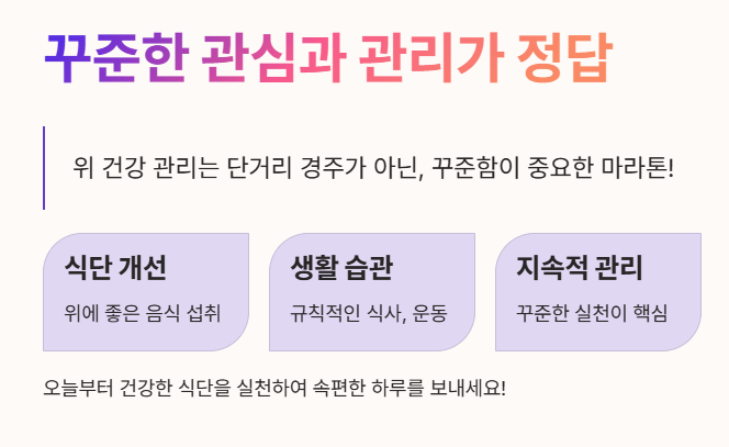 - 이와 더불어 꾸준한 운동, 충분한 수면, 긍정적인 마음으로 스트레스를 관리하고 금연과 금주를 실천하는 것이 위 건강을 지키는 최고의 방법입니다. 💪