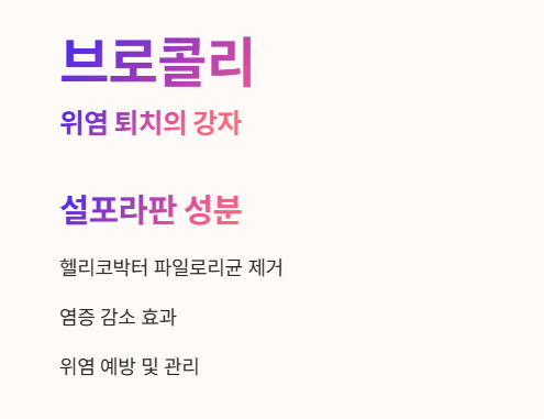- 브로콜리에 풍부한 설포라판(Sulforaphane) 성분이 위염과 위궤양의 원인 중 하나인 헬리코박터 파일로리균을 죽이는 역할을 해요. 🚁
