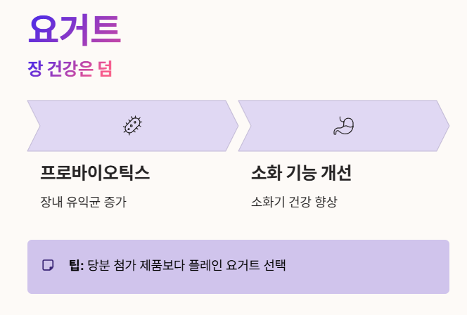- 요거트에 함유된 프로바이오틱스는 장내 유익균을 늘려 소화 기능을 돕고 전반적인 소화기 건강을 개선해요. 💪