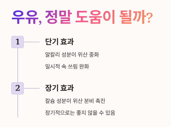 - 하지만 우유의 칼슘 성분이 나중에는 오히려 위산 분비를 촉진할 수 있어 장기적으로는 좋지 않을 수 있습니다.