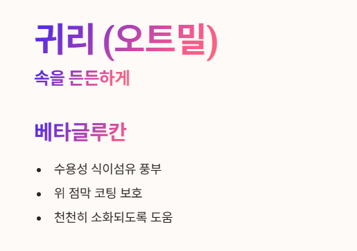 - 귀리에는 베타글루칸(Beta-glucan)이라는 수용성 식이섬유가 풍부해요.