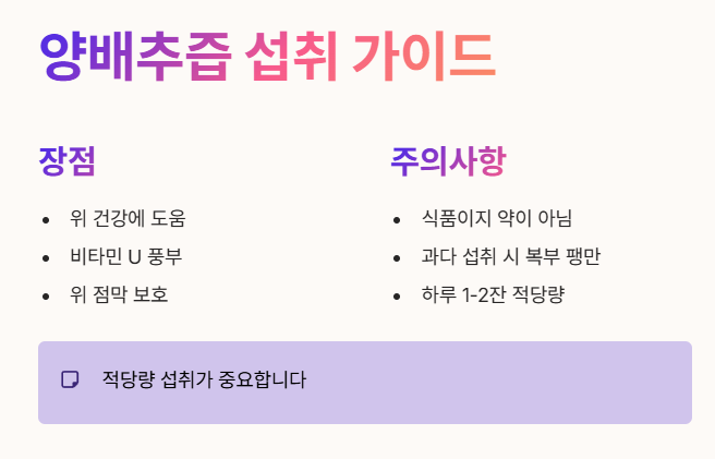 - 양배추즙은 위 건강에 도움이 되지만, 어디까지나 '식품'이지 '약'은 아니에요.