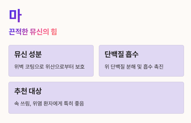 마를 잘랐을 때 나오는 끈적한 액체인 '뮤신'은 위 건강에 핵심적인 역할을 해요.