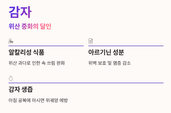 감자는 알칼리성 식품으로 위산 과다로 인한 속 쓰림 완화에 도움을 줘요.