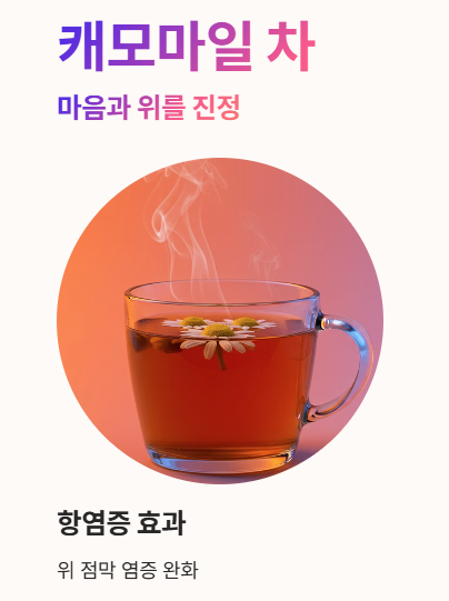 - 캐모마일은 항염증 효과가 있어 위 점막의 염증을 가라앉히는 데 도움을 줘요.