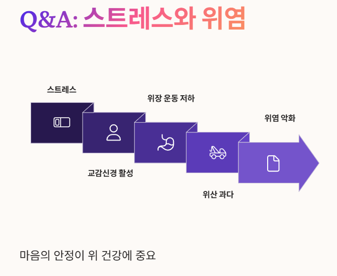 - 스트레스를 받으면 교감신경이 활성화되면서 위장 운동이 느려지고 위산이 과다하게 분비되어 위염 증상이 악화될 수 있습니다.