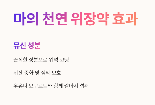 - 이 뮤신 성분이 바로 위벽을 코팅해 위산을 중화하고, 위 점막 손상을 예방하는 천연 위장약 역할을 해요.