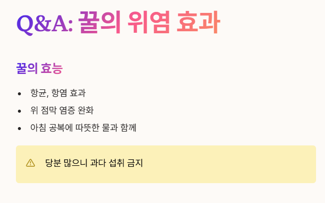 - 꿀은 항균, 항염 효과가 있어 위 점막의 염증을 완화하는 데 도움을 줄 수 있다고 알려져 있어요.