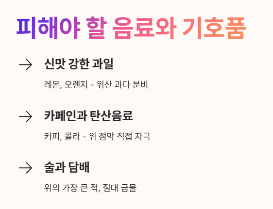 - 카페인과 탄산음료 ☕: 커피, 콜라 등은 위 점막을 직접적으로 자극해요.