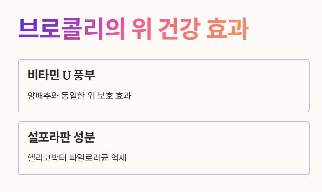 - 특히 위염과 위궤양의 원인 중 하나인 헬리코박터 파일로리균의 증식을 억제하는 '설포라판' 성분이 다량 함유되어 있어요. 🦠