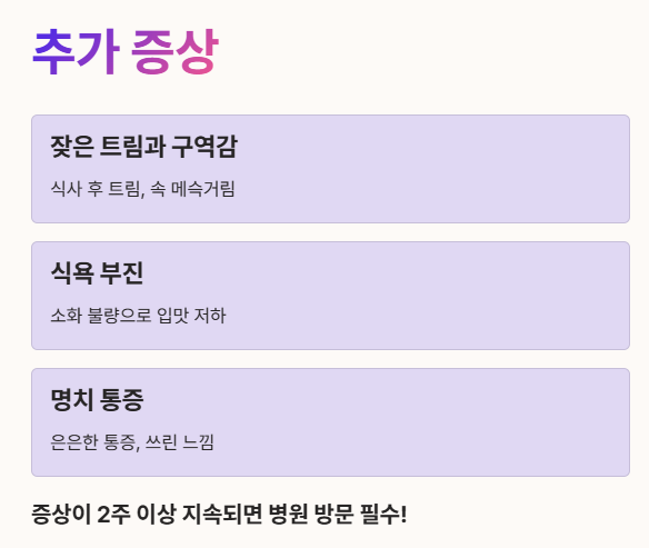 - 식사 후 트림이 계속 나오고 속이 메슥거릴 수 있어요.