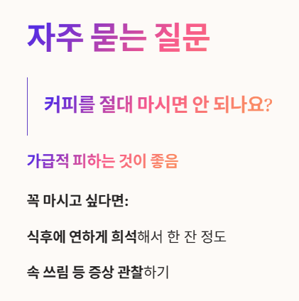 - 커피는 위산 분비를 촉진하므로 가급적 피하는 것이 좋아요. 😭