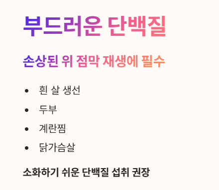 - 손상된 위 점막의 재생을 위해서는 단백질 섭취가 필수적이에요.