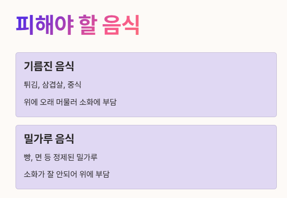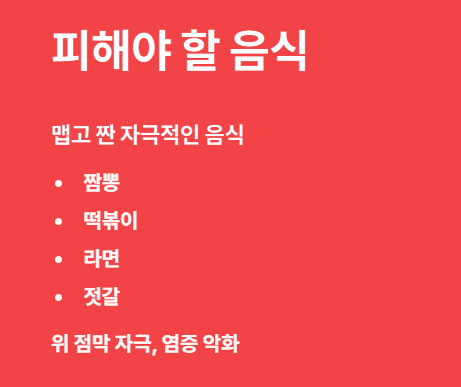 - 짬뽕, 떡볶이, 라면, 젓갈 등은 약해진 위 점막을 직접적으로 자극해 염증을 악화시켜요. 🍜