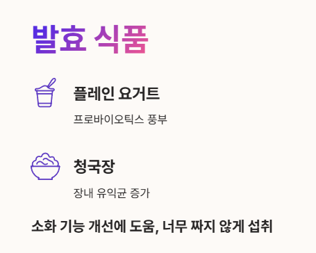 - 프로바이오틱스가 풍부한 플레인 요거트나 청국장 등은 장내 유익균을 늘려 소화 기능을 개선하는 데 도움을 줄 수 있어요.