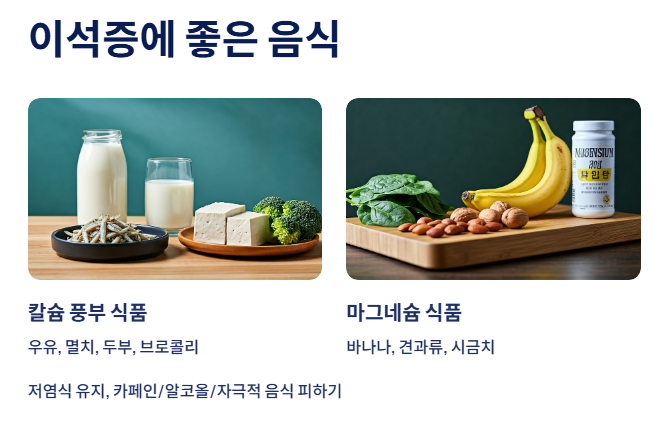 - 칼슘: 이석의 주성분인 칼슘이 부족하면 더 잘 떨어질 수 있어요.