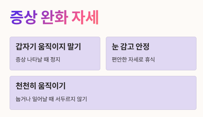 • 증상이 나타날 때는 갑자기 움직이지 말고, 눈을 감고 편안한 자세로 안정을 취하는 것이 좋아요.
