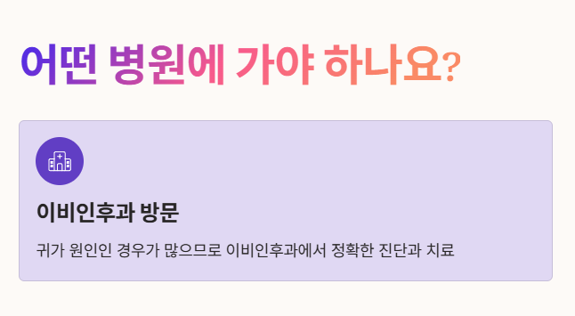 • 귀가 원인인 경우가 많으므로 '이비인후과'를 방문하여 정확한 진단과 치료를 받는 것이 가장 좋습니다.