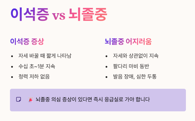 • 이석증 증상은 자세를 바꿀 때 짧게 나타나지만, 뇌졸중(중추성 어지러움)은 자세와 상관없이 지속되는 경우가 많아요.