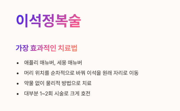 • 가장 효과적인 치료법이에요. (예: 애플리 매뉴버, 세몽 매뉴버)