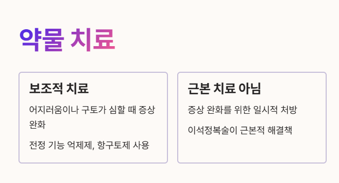 • 어지러움이나 구토가 심할 때 증상을 완화하기 위해 전정 기능 억제제나 항구토제 등을 보조적으로 사용될 수 있어요.