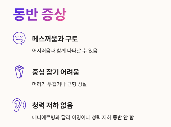 • 메니에르병과 달리, 이석증 증상은 이명(귀울림)이나 청력 저하를 동반하지 않는 것이 일반적이에요.