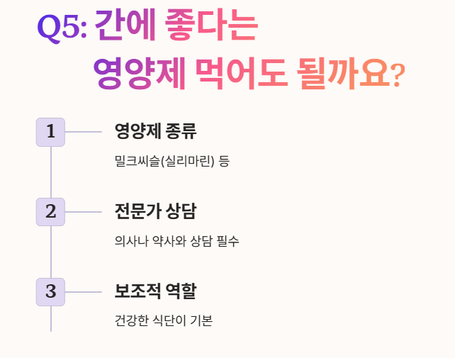 - A: 밀크씨슬(실리마린)과 같은 간 기능 개선에 도움을 주는 영양제들이 있지만, 영양제에만 의존하는 것은 바람직하지 않아요.