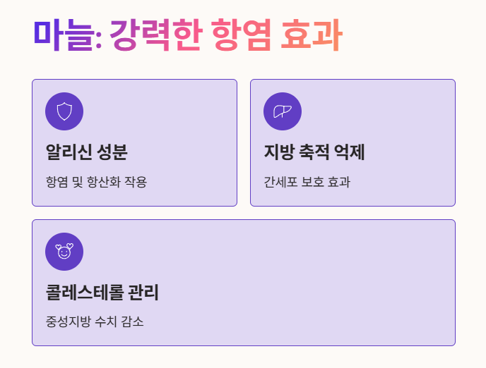 마늘의 대표 성분인 알리신은 강력한 항염 및 항산화 작용을 해요.