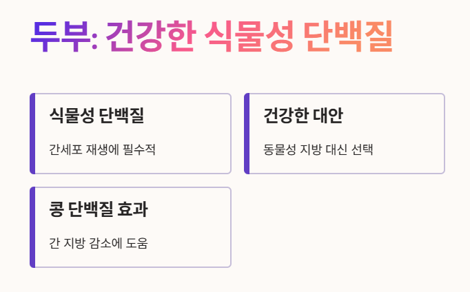 두부는 간세포 재생에 필수적인 식물성 단백질을 공급하는 훌륭한 식품이에요.