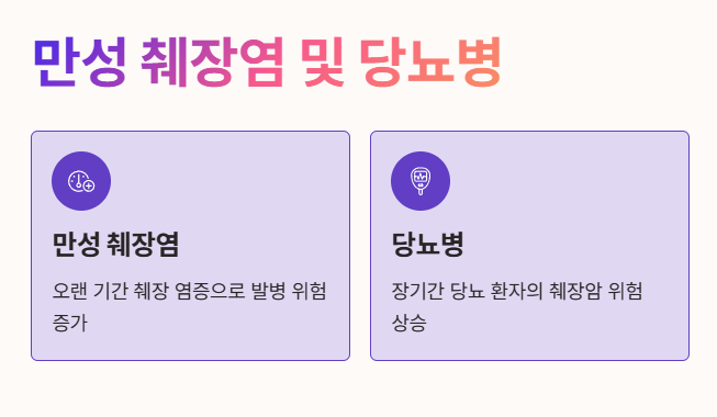 - 오랫동안 당뇨병을 앓았거나 만성 췌장염이 있는 경우 췌장암 발병 위험이 증가할 수 있습니다.