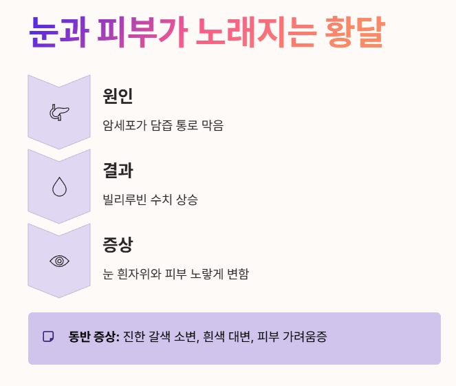- 암세포가 담즙이 내려가는 길을 막아 혈액 속 빌리루빈 수치가 높아지면서 눈의 흰자위와 피부가 노랗게 변하는 현상이에요.