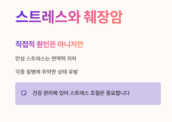 - 직접적인 원인이라고 말하기는 어렵지만, 만성적인 스트레스는 우리 몸의 면역력을 떨어뜨려 암을 포함한 각종 질병에 취약한 상태를 만들 수 있으므로 건강 관리에 있어 스트레스 조절은 중요합니다.