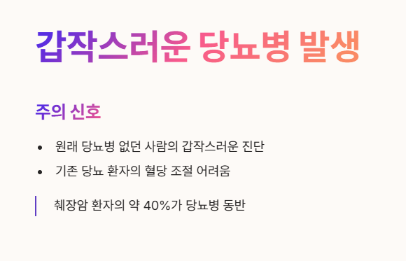 - 원래 당뇨병이 없던 사람이 갑자기 당뇨병 진단을 받거나, 기존에 당뇨병을 앓던 환자의 혈당 조절이 갑자기 어려워지는 경우 췌장암을 의심해 볼 수 있습니다. 🩸