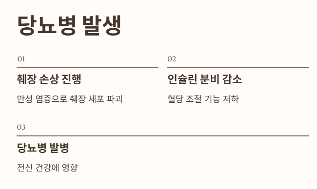 - 췌장이 더 손상되면 혈당을 조절하는 인슐린 분비 기능에도 문제가 생겨 당뇨병이 발생할 수 있습니다.
