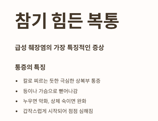 - 마치 배를 칼로 찌르는 듯한 통증이 갑작스럽게 시작되고, 점점 심해지는 양상을 보여요. 😫
