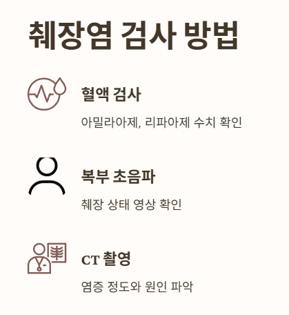 - 주로 혈액 검사(췌장 효소인 아밀라아제, 리파아제 수치 확인)를 시행합니다.