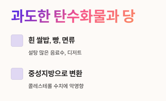 - 흰 쌀밥, 빵, 면 종류나 설탕이 많이 든 음료수, 디저트도 문제예요. 🍰