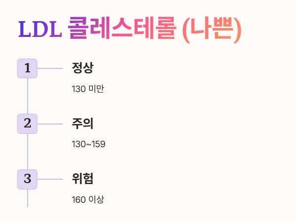• LDL(저밀도 지단백) 콜레스테롤: 흔히 '나쁜 콜레스테롤'이라고 불려요. 혈관 벽에 쌓여 동맥경화를 일으키고 심혈관 질환의 위험을 높입니다.