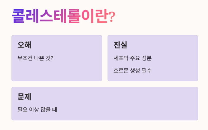 사실 콜레스테롤은 우리 몸을 구성하는 세포막의 주요 성분이고, 여러 호르몬을 만드는 데 꼭 필요한 물질이랍니다.