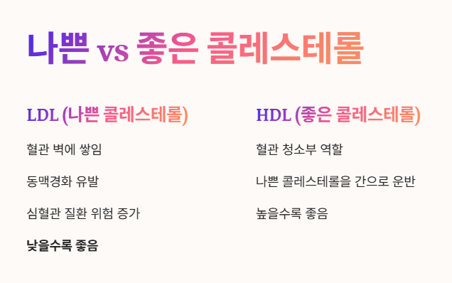 • HDL(고밀도 지단백) 콜레스테롤: '좋은 콜레스테롤'로, 혈관에 쌓인 나쁜 콜레스테롤을 간으로 운반해주는 청소부 역할을 해요.