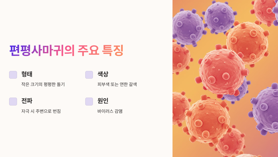 - 편평사마귀: 인유두종바이러스(HPV)로 인해 발생, 피부색 돌기 형태